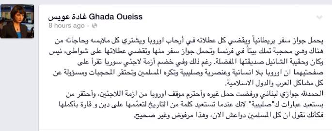 وأضافت “عويس” على صفحتها على “فيس بوك”: “الحمد لله جوازي لبناني ورفضت حمل غيره وأحترم موقف أوروبا من أزمة اللاجئين، وأحتقر من يستعيد عبارات كـ”صليبية” لأنك عندما تستعيد كلمة من التاريخ لتعمّمها على دين وقارة بأكملها فكأنك تقول إن كل المسلمين دواعش الآن، وهذا مرفوض وغير صحيح”.