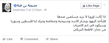 وعلقت غادة عويس قائلة: “يحمل جواز سفر بريطاني ويقضي كل عطلاته في رحاب أوروبا ويشتري كل ملابسه وحاجاته من هناك، وهي محجبة تملك بيتًا في فرنسا وتحمل جواز سفر منها وتقضي عطلاتها على شواطئ نيس وكان وحقيبة الشانيل صديقتها المفضلة، ورغم ذلك وفي خضم أزمة لاجئي سوريا تقرأ على صفحتيهما أن أوروبا بلا إنسانية وعنصرية وصليبية وتكره المسلمين وتحتقر المحجبات ومسؤولة عن كل مشاكل العرب والدول الإسلامية”.