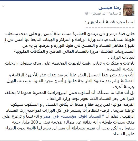 وأكد “عيسى” أن “الفرصة مواتية لمن يريد حقًّا وصدقًا أن يكافح الفساد، والسكوت سيكون تواطؤًا صريحًا، وفرصة للنظام أن يستمر في كل الوزارات لمواجهة إرث الفساد الرهيب”.