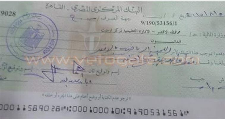نشر نشطاء على موقع التواصل الاجتماعي “فيس بوك”، صورة شيك صادر من الإدارة التعليمية بأرمنت في محافظة الأقصر، يوجب للجنة الرياضية بالأقصر الحصول على مكافأة على أحد أعمالها قدرها جنيه واحد فقط لا غير.