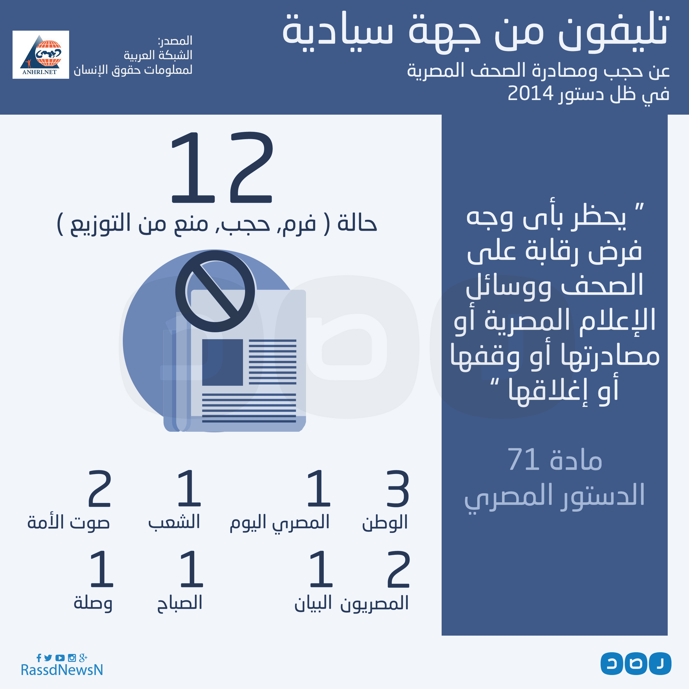 توثق الورقة حالات الحجب ومنع الطباعة والتوزيع والمصادرة التي تعرضت لها الصحف المصرية (12 حالة) في ظل الدستور المصري الحالي والذي أصبح نافذًا منذ يناير عام 2014.