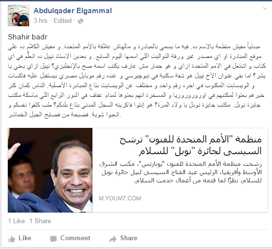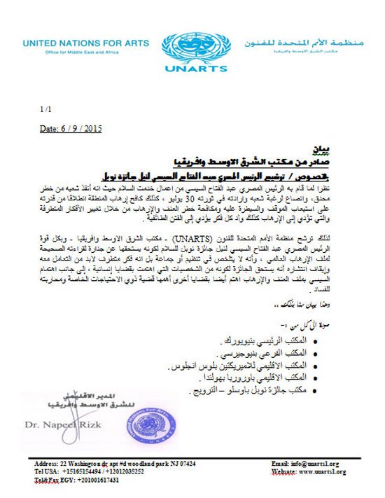 أثار الخبر الذي تداولته الصحافة المصرية المؤيدة للنظام حول ترشيح السيسي لجائزة نوبل من قبل منظمة الأمم المتحدة للفنون سخرية النشطاء على مواقع التواصل الاجتماعي؛ حيث كشف النشطاء عن فبركة بيان الأمم المتحدة من قبل نظام السيسي، وأن هذه المنظمة لا تتبع الأمم المتحدة وأنها منظمة وهمية.