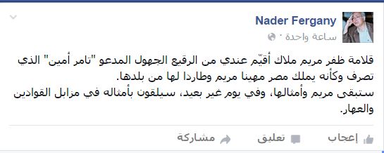 وقال -عبر منشور له على “فيس بوك”-: “قلامة ظفر” مريم ملاك أقيّم عندي من الرقيع الجهول المدعو “تامر أمين”؛ الذي تصرف وكأنه يملك مصر مهينًا مريم وطاردًا لها من بلدها”.