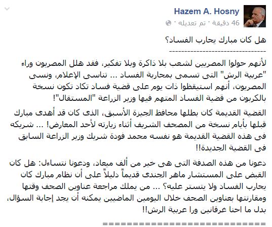 وقال حسني -عبر منشور له على “فيس بوك”-: “لأنهم حولوا المصريين لشعب بلا ذاكرة وبلا تفكير، فقد هلل المصريون وراء “عربية الرش” التى تسمى بمحاربة الفساد.. تناسى الإعلام، ونسي المصريون أنهم استيقظوا ذات يوم على قضية فساد تكاد تكون نسخة بالكربون من قضية الفساد المتهم فيها وزير الزراعة “المستقال“!.
