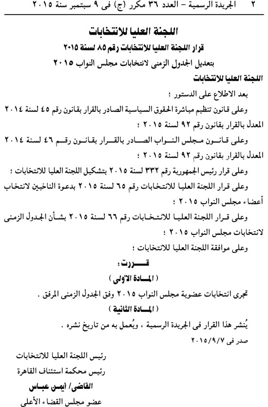 أصدرت اللجنة العليا للانتخابات قرارًا رقم 85 لسنة 2015 بتعديل الجدول الزمني لانتخابات مجلس النواب 2015.