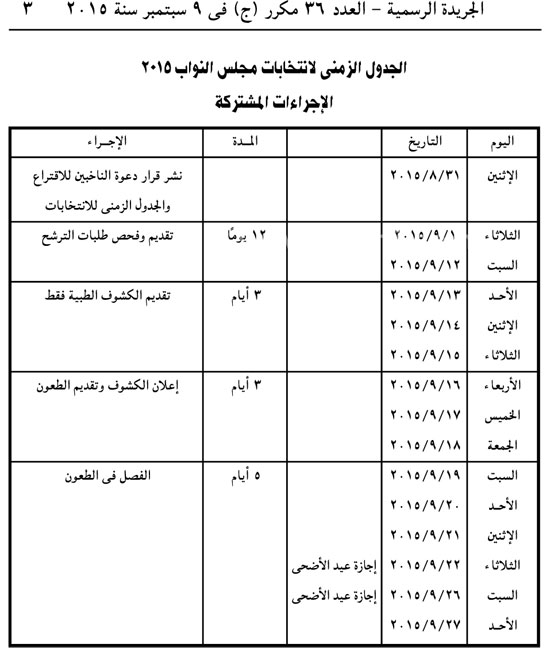 وقالت اللجنة في نص قراراها الذي نشرته اليوم بالجريدة الرسمية، إن انتخابات مجلس النواب 2015 ستجرى وفق الجدول الزمني المرفق بالقرار في الجريدة الرسمية، والذي ينص على أن فتح باب الترشح 12 يومًا فقط من يوم 1 حتى 12 سبتمبر، فيما خصصت أيام 13 و14 و15 سبتمبر لتقديم الكشوف الطبية فقط، وهذه الأيام الثلاثة كانت مخصصة لإعلان كشوف المرشحين وتقديم الطعون، وقامت اللجنة بترحيل الأيام الثلاثة المحددة لإعلان الكشوف وتقديم الطعون إلى أيام 16 و17 و18 سبتمبر 2015 بدلاً من أيام 13 و14 و15 سبتمبر.