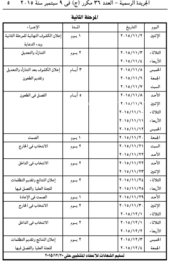 وخصصت اللجنة الأيام من 19 حتى 27 سبتمبر 2015 للفصل فى الطعون، مع مراعاة أن هذه الأيام يتخللها يومين لإجازة عيد الأضحى، فيما تبدأ اللجنة يوم 28 سبتمبر فى إعلان الكشوف النهائية للمرحلة الأولى وبدء الدعاية الانتخابية، ويومي 29 و30 سبتمبر للتنازل والتعدل، ومن يوم 1 حتى 3 أكتوبر 2015 لإعلان الكشوف بعد التنازل والتعديل وتقديم الطعون، ومن 4 حتى 8 أكتوبر للفصل في الطعون، ويوم الجمعة 16 سبتمبر للصمت الانتخابي.