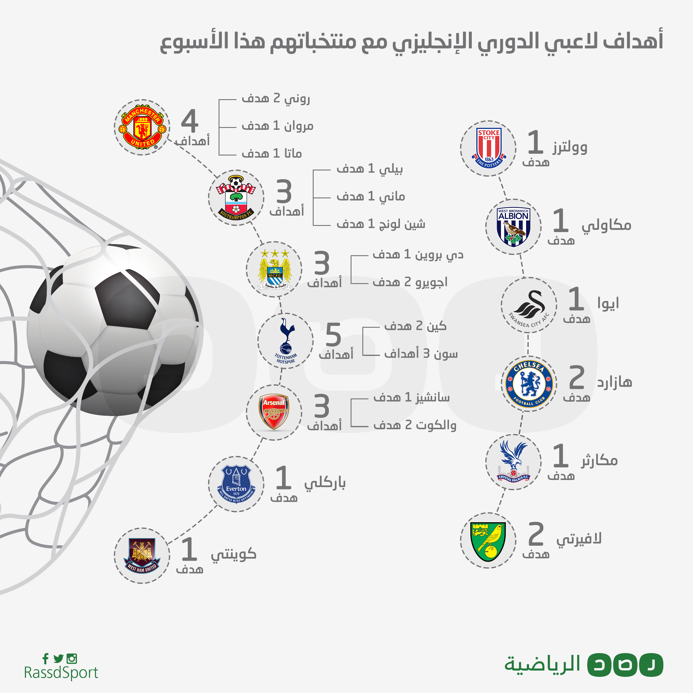 مع انتهاء الأسبوع الحالي، نعرض لكم إحصائية بأهداف لاعبي الدوري الإنجليزي الذين أحرزوها أثناء لعبهم مع منتخباتهم الوطنية طيلة الأسبوع.