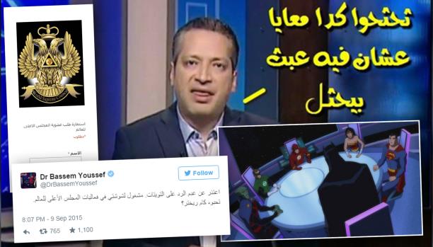 وعلق باسم يوسف علي تصريحات تامر أمين قائلًأ على حسابه على تويتر : “أعتذر عن عدم الرد على التويتات، مشغول لشوشتي في فعاليات المجلس الأعلى للعالم، تحبوه كام ريختر؟”.