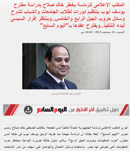 من أجل أن يجود المكتب الإعلامى لرئاسة الجمهورية – المشغولة بمواجهة حروب الجيل الرابع – عمله، عرضوا على السيسى المقترح الوارد فى المقال بتنظيم دورات تدريبية مكثفة لطلاب الجامعات والشباب، لشرح أساليب ووسائل حروب الجيل الرابع والخامس، مع توصية بالبدء فوراً فى عقد هذه الندوات داخل مقر جريدة “اليوم السابع” بعد موافقة السيسى على الفكرة.