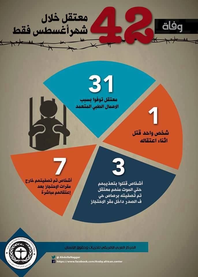 رصد المركز العربي الإفريقي للحريات وحقوق الإنسان، تضاعف أعداد حالات الوفاة داخل السجون ومقار الاحتجاز في مصر، خلال شهر أغسطس الماضي، حيث وثق المركز 42 حالة وفاة خلال الشهر.