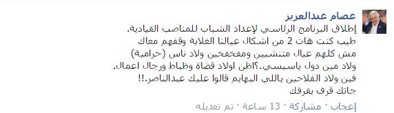 وسخر عصام عبدالعزيز قائلًا: “طيب كنت هات 2 من أشكال عيالنا الغلابة وقفهم معاك مش كلهم عيال متنشيين ومفخفخين ولاد ناس (حرامية)، ولاد مين دول ياسيسي؟ أظن أولاد قضاة وظباط ورجال أعمال، فين ولاد الفلاحين ياللي البهايم قالوا عليك عبدالناصر.!”