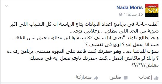 وعلقت nada moris قائلة: “ألطف حاجة في برنامج إعداد القيادات بتاع الرياسة إن كل الشباب اللي أكبر شوية من الحد اللي مطلوب.. زعلانين قوي.. واحد طالع يقول: “يعني أنا سني 32 سنة واللي مطلوب حتى سن الـ30.. طب انا اعمل ايه؟ أولع في نفسي؟”.
