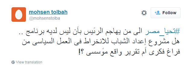 وقال mohsen tolbah: “تحيا مصر.. إلى من يهاجم الرئيس بأنه ليس لديه برنامج.. هل مشروع إعداد الشباب للانخراط في العمل السياسي من فراغ فكري أم تقرير واقع مؤسسي؟!”.