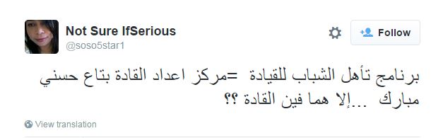 وعلقت soso5star1 قائلة: “برنامج تأهل الشباب للقيادة =مركز إعداد القادة بتاع حسني مبارك.. ألا هما فين القادة؟؟”.