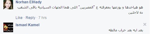 وقالت نورهان هادي: “هو هياخدها و يوزعها بمعرفته ع “المصريين” اللى هما الجهات السيادية باقى الشعب ده لاجئين”.