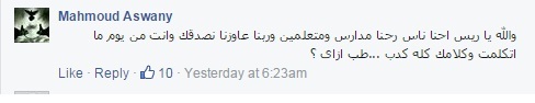 وكتب محمود الأسواني تعليقًا على تصريحات “السيسي” عبر فيس بوك قائلاً: “والله يا ريس احنا ناس رحنا مدارس ومتعلمين وربنا عاوزنا نصدقك وانت من يوم ما اتكلمت وكلامك كله كدب …طب ازاى ؟”.