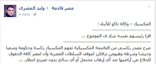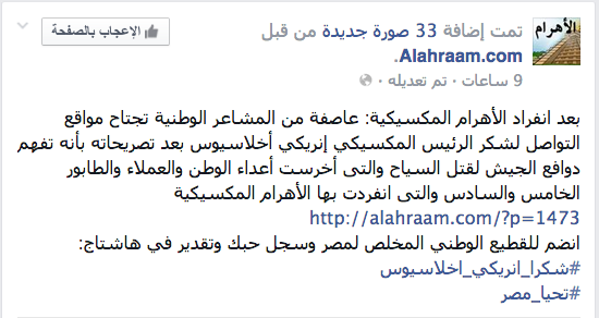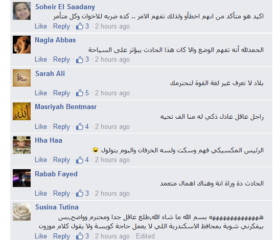 كما نشرت صفحة الأهرام المكسيكي، على صفحتها على موقع “فيس بوك”، عددًا من المشاركين في هاشتاج تأييد الرئيس المكسيكي قائلة: “بعد انفراد الأهرام المكسيكية: عاصفة من المشاعر الوطنية تجتاح مواقع التواصل لشكر الرئيس المكسيكي إنريكي أخلاسيوس بعد تصريحاته بأنه تفهم دوافع الجيش لقتل السياح والتي أخرست أعداء الوطن والعملاء والطابور الخامس والسادس والتي انفردت بها الأهرام المكسيكية”.