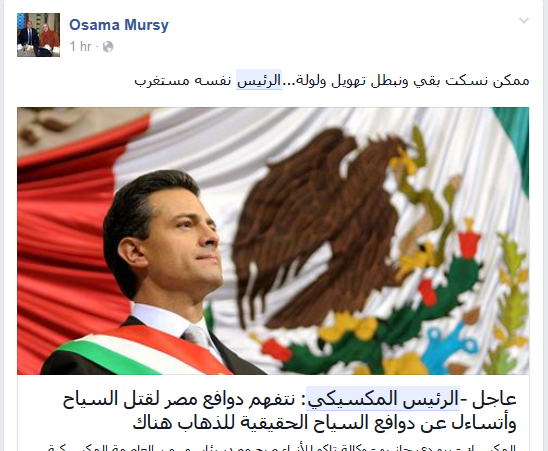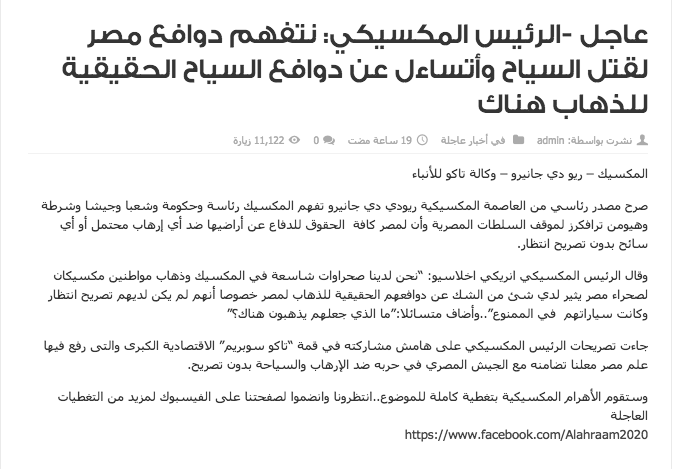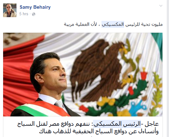 واستكمل الخبر الساخر: “قال الرئيس المكسيكي انريكي اخلاسيو: نحن لدينا صحراوات شاسعة في المكسيك وذهاب مواطنين مكسيكيين لصحراء مصر يثير لدي شيء من الشك عن دوافعهم الحقيقية للذهاب لمصر خصوصًا أنهم لم يكن لديهم تصريح انتظار وكانت سياراتهم في الممنوع”. وأضاف متسائلًا: “ما الذي جعلهم يذهبون هناك؟”.