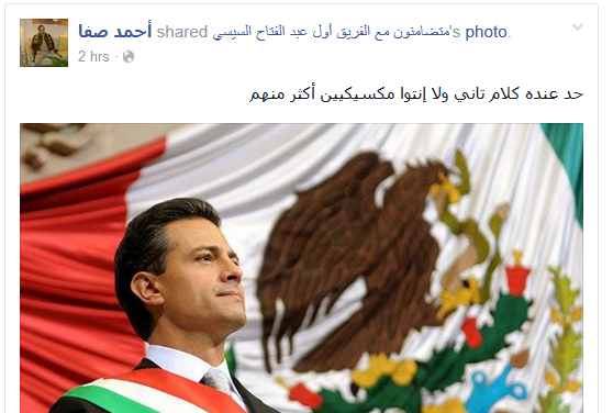 وبالبحث، تبين أن “تاكو سوبريم” هي وجبة طعام تشتهر في المكسيك، إلا أن مؤيدي قائد الانقلاب العسكري عبدالفتاح السيسي دشنوا على موقعي “فيس بوك” و”تويتر” هاشتاج “#شكرا_انريكي_اخلاسيوس” ، وذلك لتأييد تصريحات الرئيس الميكسيكي.
