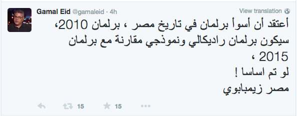 وأضاف عيد عبر “توتير”: “أعتقد أن أسوأ برلمان في تاريخ مصر كان برلمان 2010، لكنه سيكون برلمانًا راديكاليًا ونموذجيًا، مقارنة مع برلمان 2015 ، لو تم أساسًا.