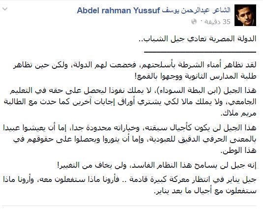 وقال -عبر منشور له على “فيس بوك”-: “لقد تظاهر أمناء الشرطة بأسلحتهم، فخضعت لهم الدولة، ولكن حين تظاهر طلبة المدارس الثانوية وجدوا القمع!“.