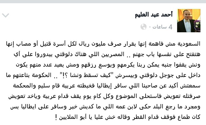 وعلق الإعلامي المصري أحمد عبدالعليم على الخبر قائلًا: “إن السعودية بقرار صرف مليون ريال لكل أسرة قتيل أو مصاب تفتح على نفسها باب جهنم”.