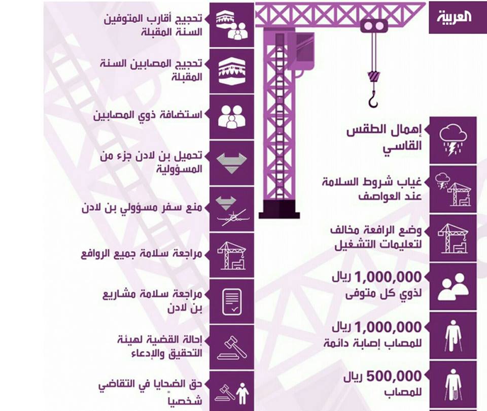 كما أمر الملك سلمان بالتحقيق مع شركة “مجموعة بن لادن” المسؤولة عن تشغيل الرافعة الضخمة التي سقطت، بالإضافة إلى إيقاف تصنيف “بن لادن” ومنعها من الدخول في أية منافسات أو مشاريع جديدة، إلى حين استكمال التحقيقات وصدور الأحكام القضائية في هذه الحادثة، كون التحقيقات أكدت وضع الرافعة بشكل خاطئ لحظة سقوطها.
