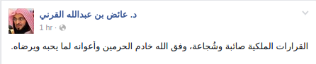 وقال -في تدوينة عبر صفحته الرسمية على موقع التواصل الاجتماعي “فيس بوك”-: “القرارات الملكية صائبة وشُجاعة، وفق الله خادم الحرمين وأعوانه لما يحبه ويرضاه”.