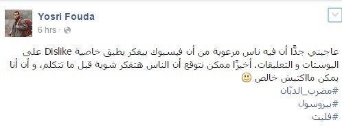 أما الإعلامي يسري فودة فقد أبدى إعجابه بالقرار، وكتب منشورا عبر صفحته على موقع التواصل الاجتماعي “فيس بوك” قال فيه: “عاجبني جدًّا إن فيه ناس مرعوبة من أن فيسبوك بيفكر يطبق خاصية Dislike على البوستات والتعليقات، أخيرًا ممكن نتوقع أن الناس هتفكر شوية قبل ما تتكلم، وإن أنا يمكن ما اكتبش خالص”.