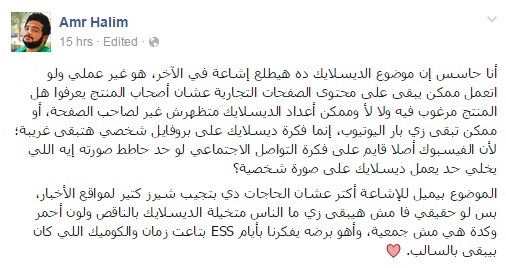وقال عمرو حليم: “أنا حاسس إن موضوع الديسلايك ده هيطلع إشاعة في الآخر، هو غير عملي ولو اتعمل ممكن يبقى على محتوى الصفحات التجارية علشان أصحاب المنتج يعرفوا هل المنتج مرغوب فيه ولا لأ، وممكن أعداد الديسلايك ماتظهرش غير لصاحب الصفحة، أو ممكن تبقى زي بار اليوتيوب، إنما فكرة ديسلايك على بروفايل شخصي هتبقى غريبة؛ لأن الفيسبوك أصلا قايم على فكرة التواصل الاجتماعي لو حد حاطط صورته إيه اللي يخلي حد يعمل ديسلايك على صورة شخصية؟”.