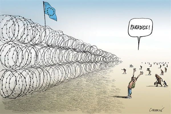 وسلطت الرسومات الضوء على الأزمة المتفاقمة لنزوح اللاجئين السوريين إلى أوروبا، فاختارت صحيفة “دومينيون بوست” أن تشير إلى دول الاتحاد الأوروبي على أنها “الجنة” بالنسبة للمهاجرين.
