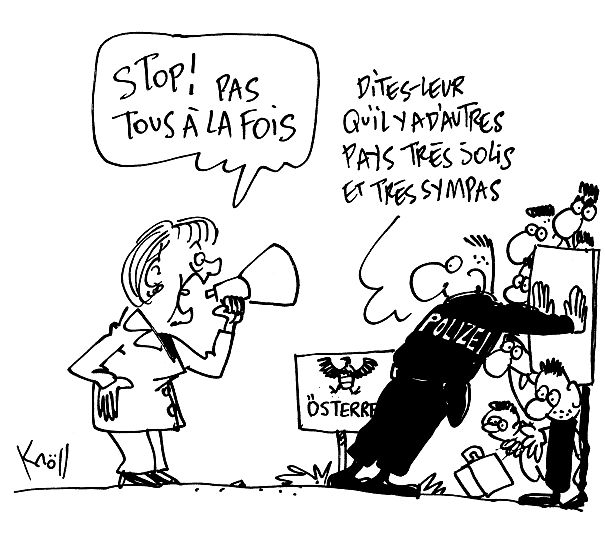 وأظهر الكاريكاتير ميركل وهي تقول للاجئين عبر مكبرات الصوت “قفوا، وكفى ليس كل مرة نستقبلكم”، بينما يقول الشرطي الذي يهم بقفل الحدود بوجه اللاجئين “اذهبوا فهناك دول أخرى لطيفة وجميلة”.