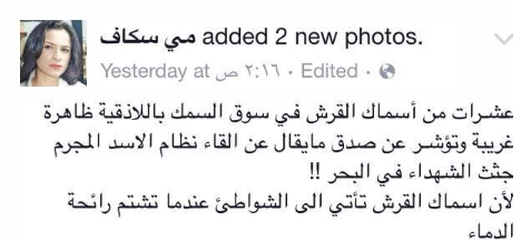 قالت الفنانة السورية، مي سكاف، أمس الجمعة، إن ظاهرة بيع أسماك القرش في سوق السمك بمدينة اللاذقية، مؤشر على إلقاء نظام الأسد جثث ضحاياه في البحر.