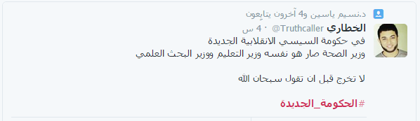 فقال الخطاري ساخرًا: “في حكومة السيسي الانقلابية الجديدة وزير الصحة صار هو نفسه وزير التعليم ووزير البحث العلمي، لا تخرج قبل أن تقول سبحان الله”.