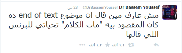وكتب باسم يوسف، في حسابه على موقع “تويتر”: “مش عارف مين قال إن موضوع end of text ده كان المقصود بيه مات الكلام تحياتي للبرنس اللي قالها”.