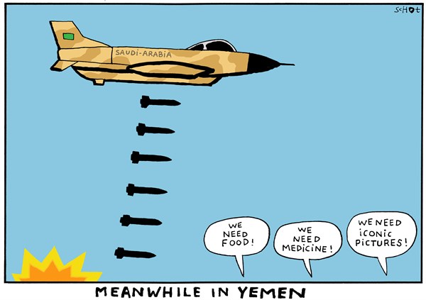 نشرت الصحف العربية والعالمية عددا من الكاريكاتيرات المهتمة بالشأن العربي والعالمي، ولعل من أبرزها ما نشرته “التايمز” البريطانية حول معاناة اليمنيين أثناء الحرب بين الحوثيين والتحالف العربي حيث يحتاجون للطعام والدواء.
