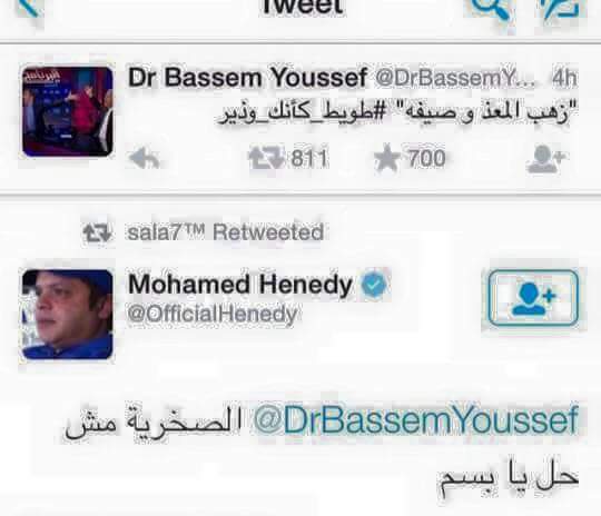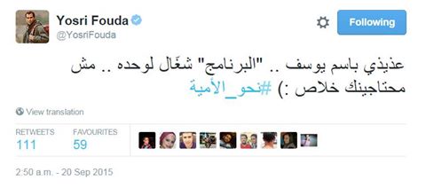 ويسخر الإعلامي يسري فودة: “عذيذي باسم يوسف البرنامج شغال لوحده مش محتاجينك خلاص”. #نحو_الأمية