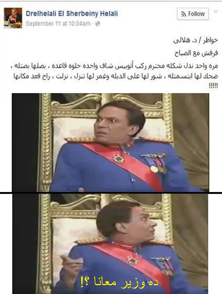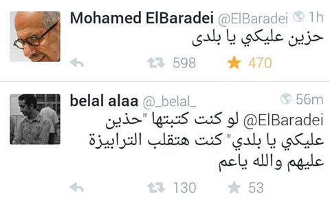 وتعليقًا على تدوينة الدكتور محمد البرادعي والتي قال فيها: “حزين عليكي يا بلدي” تعليقًا على تشكيل الحكومة الجديدة، قال الناشط بلال علاء: “لو كنت كتبتها حذين عليكي يا بلدي كنت قلبت عليهم التربيزة والله أعلم”.