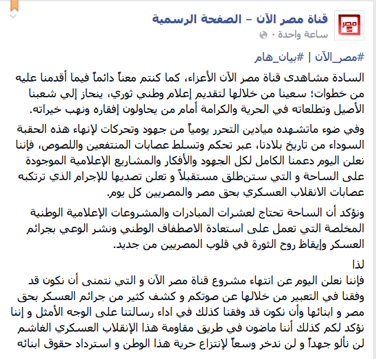 واختتم البيان: “فإننا نعلن اليوم عن انتهاء مشروع قناة “مصر الآن” والتي نتمنى أن نكون قد وفقنا في التعبير من خلالها عن صوتكم وكشف كثير من جرائم العسكر بحق مصر وأبنائها، وأن نكون قد وفقنا كذلك في أداء رسالتنا على الوجه الأمثل، وإننا نؤكد لكم كذلك أننا ماضون في طريق مقاومة هذا الانقلاب العسكري الغاشم لن نألو جهدًا ولن ندخر وسعًا لانتزاع حرية هذا الوطن واسترداد حقوق أبنائه”.