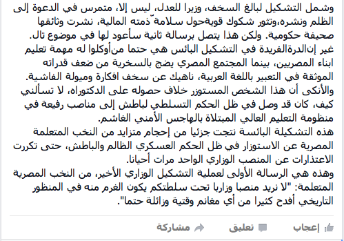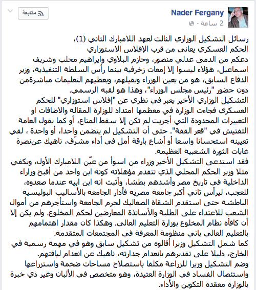 وذكر “فرجاني”، أن التشكيل الأخير استدعى وزراء من أسوأ من عيّن اللامبارك الأول، ويكفي مثلًا وزير الحكم المحلي الذي تتقدم مؤهلاته كونه ابن واحد من أقبح وزاراء الداخلية في تاريخ مصر وأشدهم بطشًا، وأثبت أنه ابن أبيه عندما صعدوه، للعجب، ليرأس ثاني أكبر جامعة مصرية، فأدار الجامعة بالأساليب البوليسية الباطشة حتى استقدم الشقاة الصعاليك لحرم الجامعة واستأجرهم من أموال الشعب للاعتداء على الطلبة والأساتذة المعارضين لحكم المخلوع. ولم يكن إلا أن كافأه نظام المخلوع بوزارة التعليم العالي. وهكذا كان مقدار اهتمامهم بالتعليم العالي باني منظومة المعرفة في المجتمعات المتقدمة.