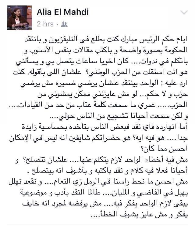 قالت عالية المهدي، القيادية السابقة بالحزب الوطني، إنه وقت حكم الرئيس المخلوع حسني مبارك، كانت تخرج إلى الإعلام بحرية وتنتقد الحكومة بصورة واضحة، وتكتب مقالات بنفس الأسلوب وتتحدث في ندوات.