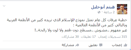 وقال أبو خليل -الذي يشغل منصب مدير مركز ضحايا لحقوق الإنسان- في منشور له على صفحته بـ”فيسبوك”: “خطبة عرفات كل عام تمثل نموذجًا للإسلام الذي تريده كثير من الأنظمة العربية”.