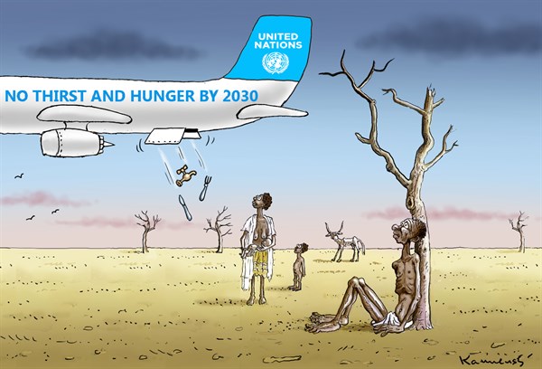 وتوجهت صحيفة “الجارديان” نحو تصريحات الأمم المتحدة بأنه “لا عطشى ولا جوعى بعد عام 2030″، فقامت بنشر هذا الرسم للسلوفاكية ماريان كمينيسكي: