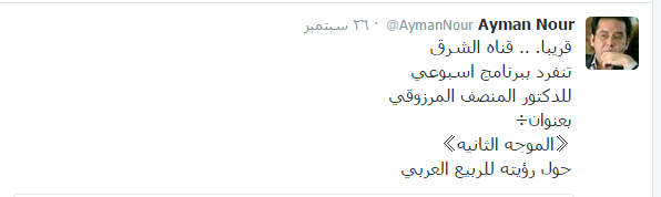 وكتب “نور” -عبر حسابه على “تويتر”-: “قريبًا.. قناة الشرق تنفرد ببرنامج أسبوعي للدكتور المنصف المرزوقي بعنوان “الموجة الثانية”، حول رؤيته للربيع العربي”.