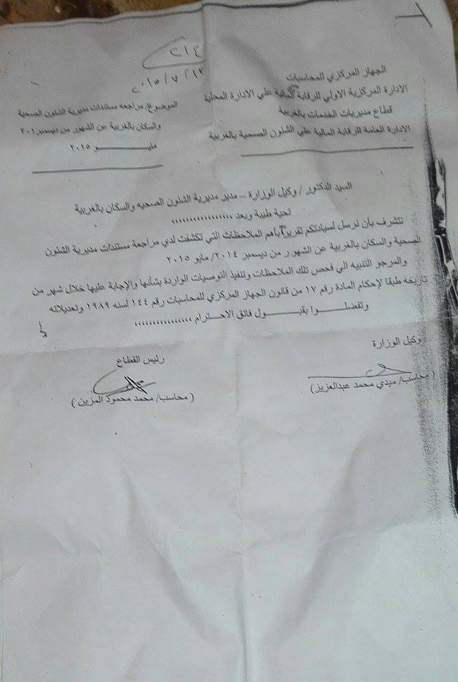 وكان الجهاز المركزي للمحاسبات قطاع مديريات الخدمات بالغربية الإدارة العامة للرقابة المالية على الشؤون الصحية، قام بمراجعة مستندات مديرية الشؤون الصحية والسكان بالغربية عن الشهور من ديسمبر 2014 وحتي مايو 2015 أرسل خطابًا في يوليو الماضي إلى مديرية الصحة بالغربية بها تقرير الجهاز عن أهم الملاحظات التي تكشفت لدى مراجعة مستندات مديرية الصحة.