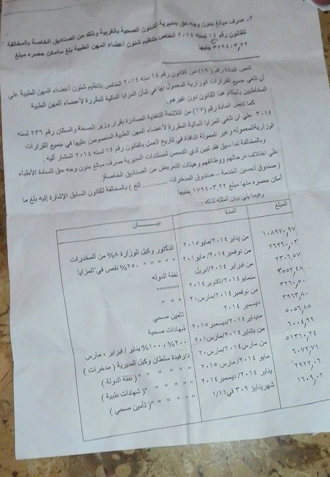 وتبين صرف مبالغ دون وجه حق بالمديرية، وذلك من الصناديق الخاصة بالمخالفة للقانون رقم 14 لسنة 2014 الخاص بتنظيم شؤون أعضاء المهن الطبية بلغ ما أمكن حصره مبلغ 379403 جنيهات؛ حيث تنص المادة رقم 19 من القانون رقم 14 لسنة 2014 الخاص بتنظيم شؤون أعضاء المهن الطبية على أن تلغى جميع القرارات الوزارية المعمول بها في شأن المزايا المقررة لأعضاء المهن الطبية المخاطبين بأحكام هذا القانون دون غيرهم، كما تنص المادة رقم 17 من اللائحة التنفيذية الصادرة بقرار وزير الصحة والسكان رقم 236 لسنة 2014 على أن تلغى المزايا المالية لأعضاء المهن الطبية المنصوص عليها في جميع القرارات الوزارية المعمولة وغير الممولة النافذة في تاريخ العمل بالقانون رقم 14 لسنة 2014 المشار إليه وبالمخالفة لما سبق.