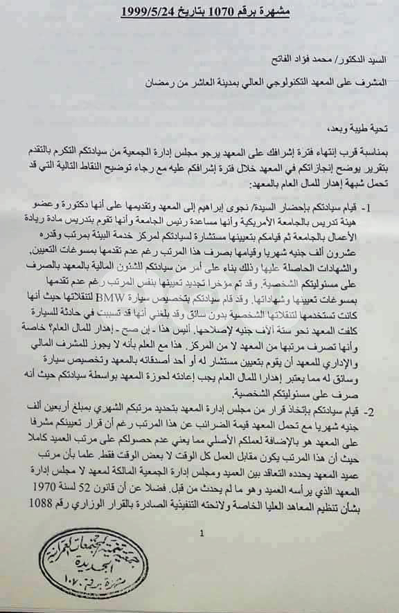 - تعيين السيدة نجوى إبراهيم، كأستاذ جامعي لمادة ريادة الأعمال، براتب 20,000 جنيها، دون التقدم بالمؤهلات والشهادات التي تثبت ذلك.