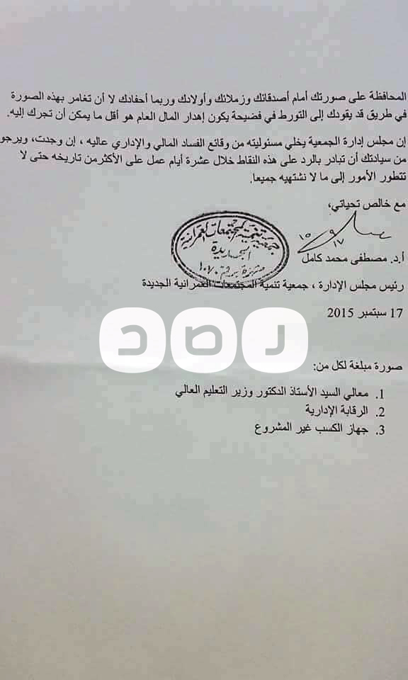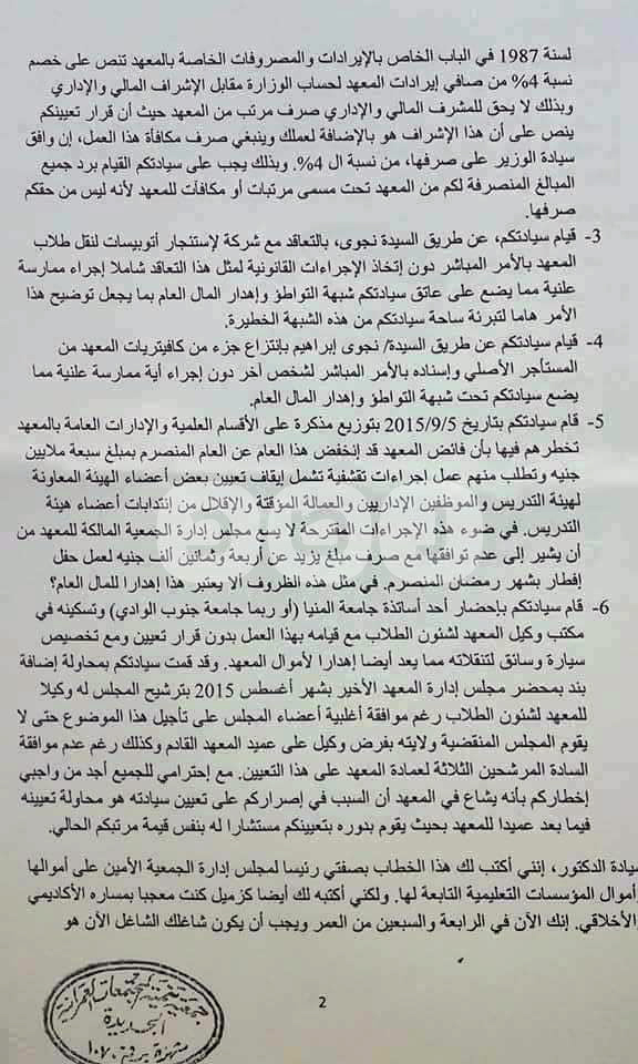 - التعاقد مع شركة لاستئجار أوتوبيسات لنقل الطلبة، دون عمل مناقصات أو الرجوع لملاك المعهد، مما يعطي الشكوك بالتواطؤ مع الشركة وكذلك إهدار المال العام.