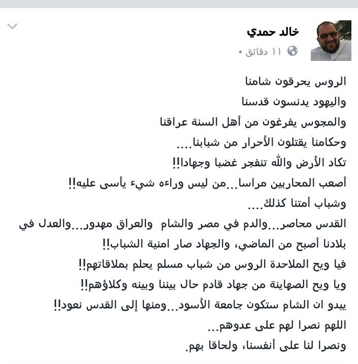 وأضاف “القدس محاصر… والدم في مصر والشام والعراق مهدور… والعدل في بلادنا أصبح من الماضي، والجهاد صار أمنية الشباب، فيا ويح الملاحدة الروس من شباب مسلم يحلم بملاقاتهم، ويا ويح الصهاينة من جهاد قادم حال بيننا وبينه وكلاؤهم، يبدو أن الشام ستكون جامعة الأسود… ومنها إلى القدس نعود”.